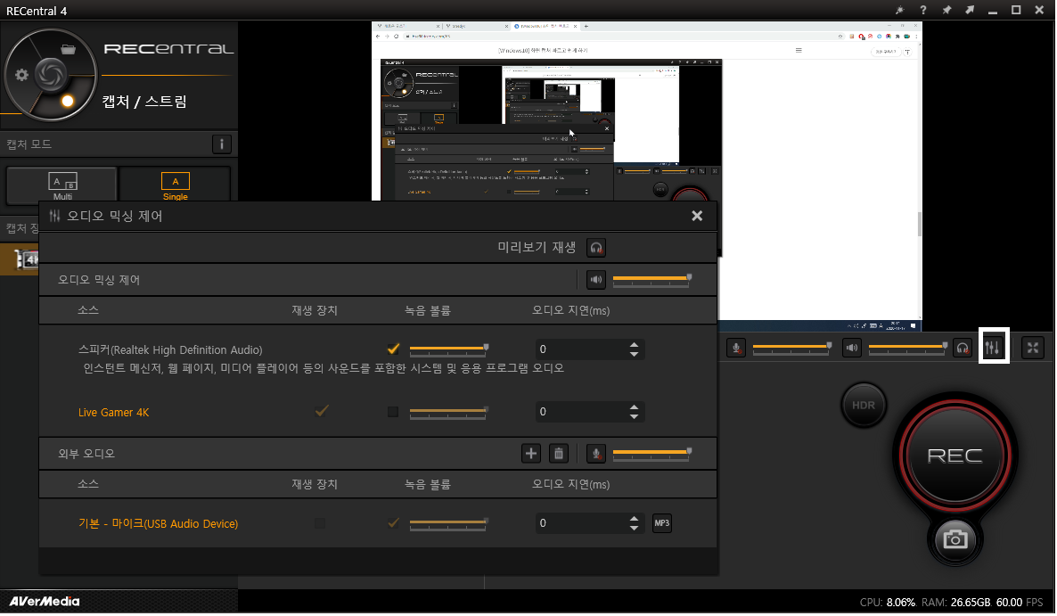 이제 소리 관련 설정입니다. 제 장치가 이상한 건진 몰라도 Live Gamer 4K 이쪽으로 녹음을 잡으면 소리가 깨지고 원활히 녹화가 안되서 전 Realtek을 녹음 볼륨을 잡아줬습니다. 오디오 지연은 당연히 없어야 소리 밀림이 없고 외부 오디오 마이크는 보시다시피 꺼둔 상태입니다. 미리보기 녹화에 소리가 제대로 반영되나 컴퓨터에서도 재생되는 옵션인데 지금 제대로 소리 나나 싶을때 체크하셔서 소리 들어보셔도 됩니다. 컴퓨터에 따라 천차만별이라 이 설정에서 반드시 소리가 원할히 녹화가 되는 건 아닙니다만 특이사항 없으면 날 겁니다.