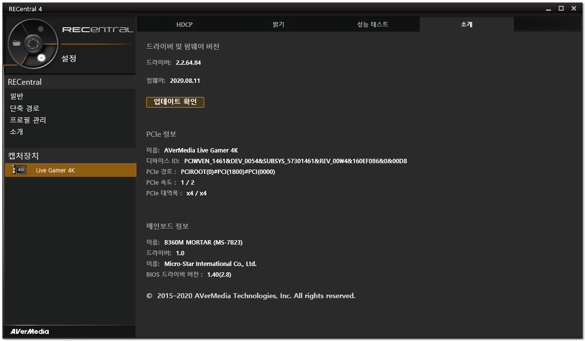 이 밝기 옵션은 화면 밝기를 말하는 게 아니라 캡처보드 옆에 쓸데없이 반짝거리는 저 빛을 말하는 건데 효과를 주면 여러 색으로 변하면서 발광하기도 하고 그렇습니다.