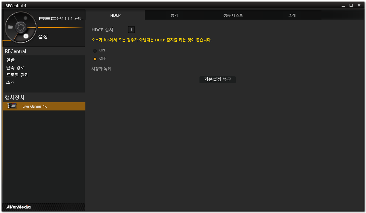 이제 아래 캡처 장치 버튼을 누르면 나오는 옵션인데 HDCP란게 있습니다. 이게 무슨 기능이냐면 저작권 보호를 받는 콘텐츠의 녹화를 자체에서 제한하는 겁니다. 켜 놓았을 때 갑자기 뜬금없이 활성화돼서 화면 녹화가 안되기도 해서 전 꺼놓습니다만 활용하신다면 켜놓으세요. (이걸 어떤 식으로 활용할지도 잘 모르겠지만)
